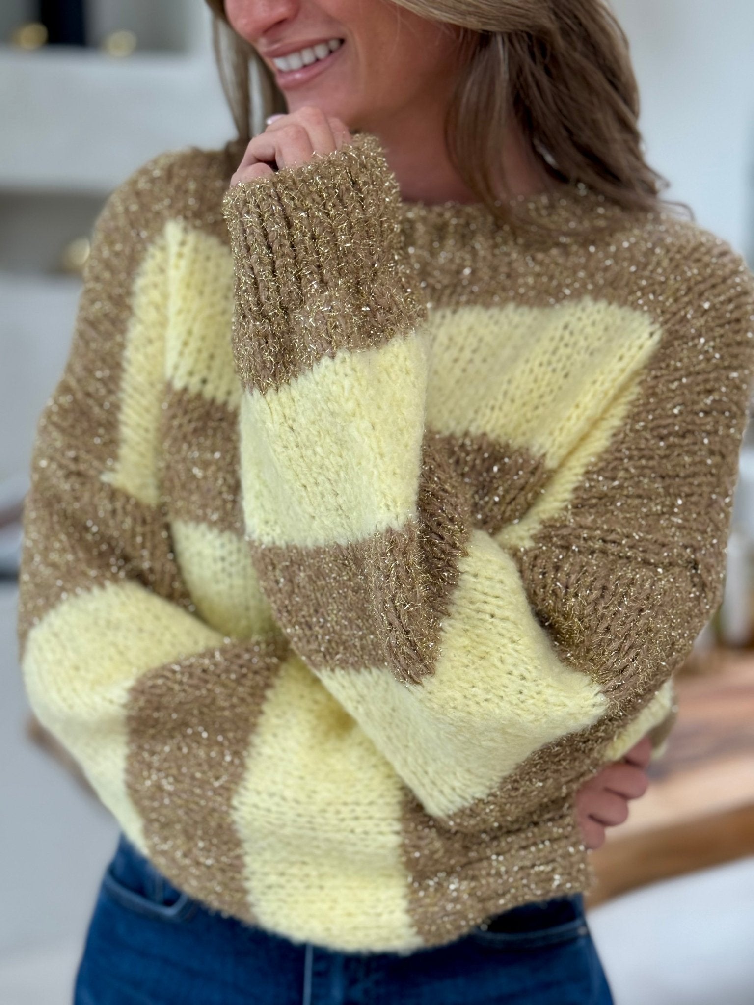 Un pull rayé lumineux qui mixe douceur, chaleur et touche brillante. Ses bandes beige et jaune pâle, associées au fil légèrement scintillant, créent un style cosy mais élégant. La coupe loose apporte un confort parfait pour la saison.
