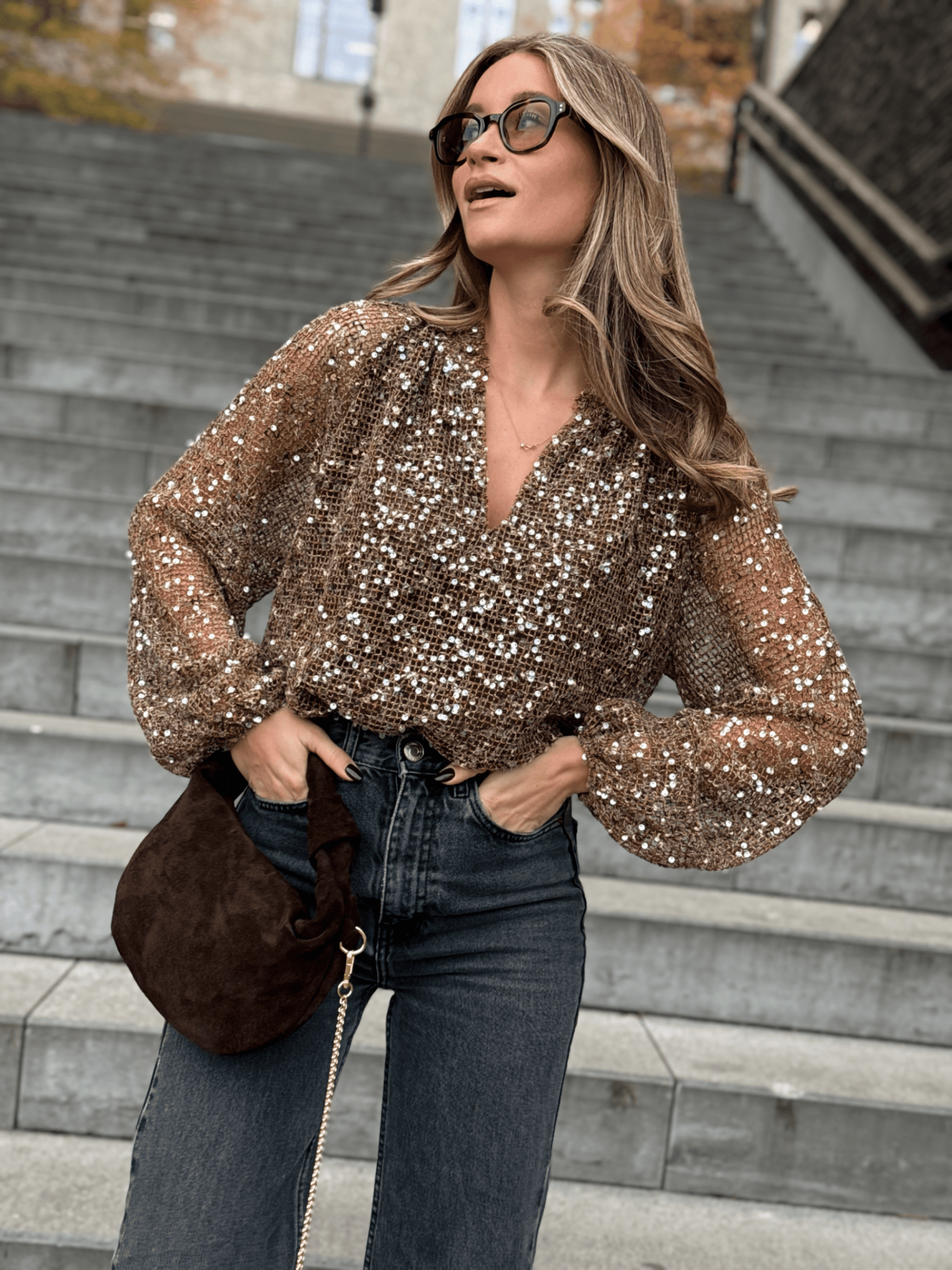 🌸 La blouse Garance marron – Féminité scintillante et charme bohème