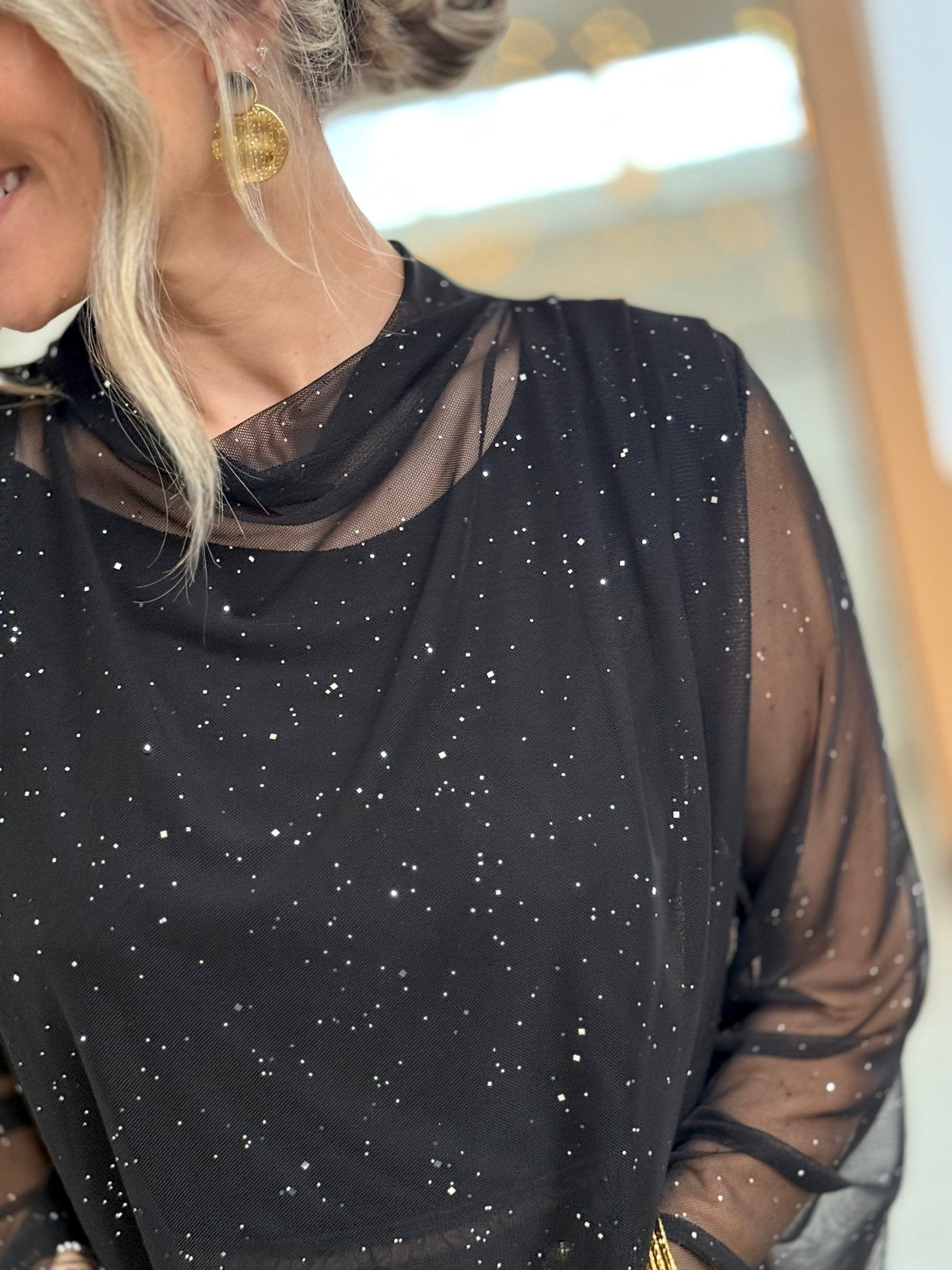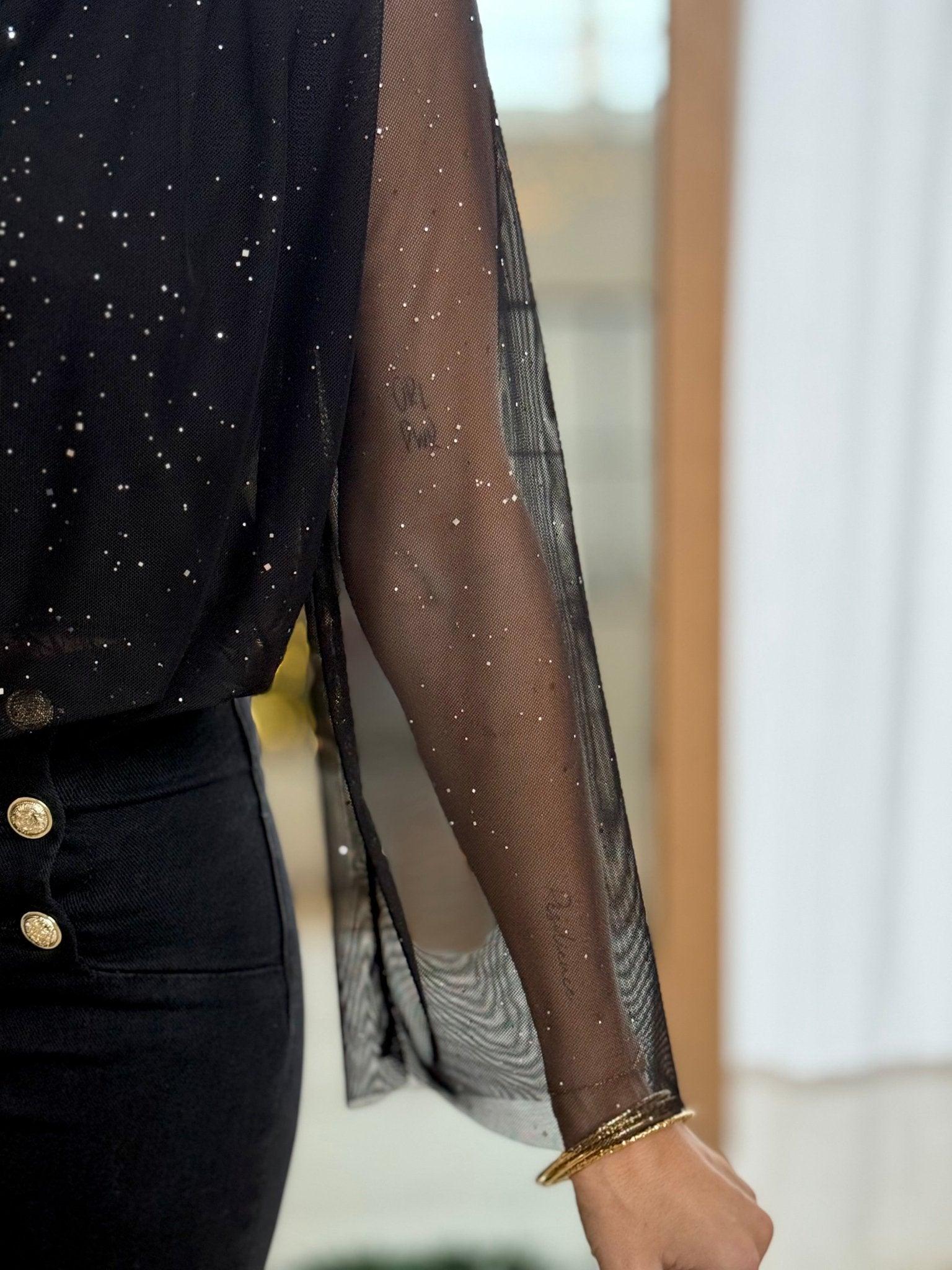 Body élégant en voile transparent et strass, avec doublure intérieure (hors manches) pour un confort optimal. Sa coupe courte et son bas élastiqué créent un effet blousant très féminin.